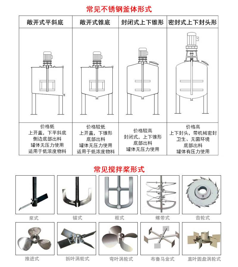 由于用戶需要,反應釜生產工藝及操作條件不盡相同,主要類型有電熱棒加熱、蒸汽加熱,軸封裝置主要有填料密封和機械密封,開孔數量及參數規格需要根據具體要求定制生產。