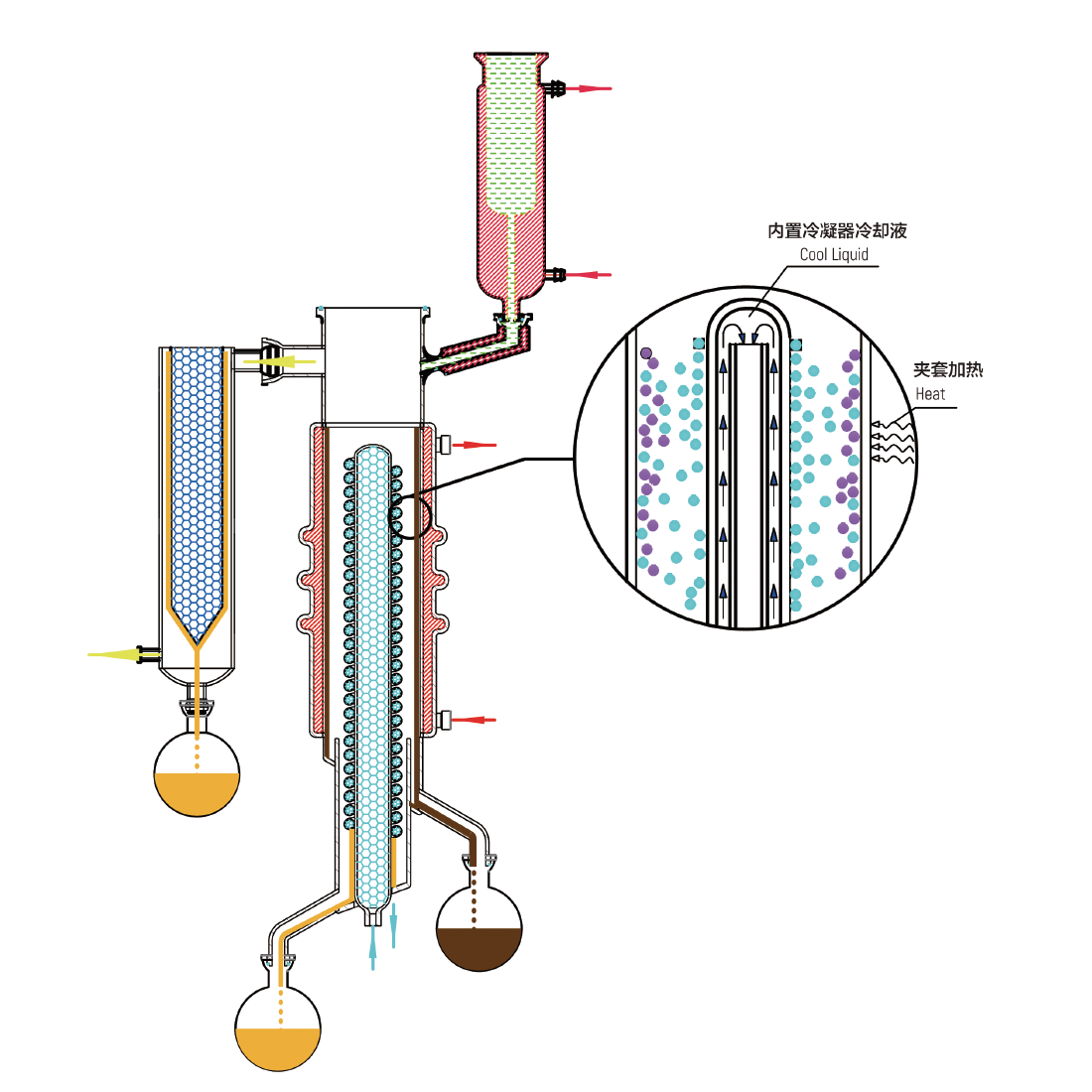 并以螺旋狀向下推進。在機身的中心是一個與加熱面非常近的內置冷凝器,為蒸汽分子從加熱表面移動到冷凝面提供了一個短程。在下降過程中,料液中較輕,低沸點的物質開始汽化,活動到內部冷凝器并冷凝,變為液體下流到清分組接收瓶。較重的物質(如葉綠素,鹽,糖,臘)不會蒸發,而是會沿著主蒸發器流入重組分接流瓶。